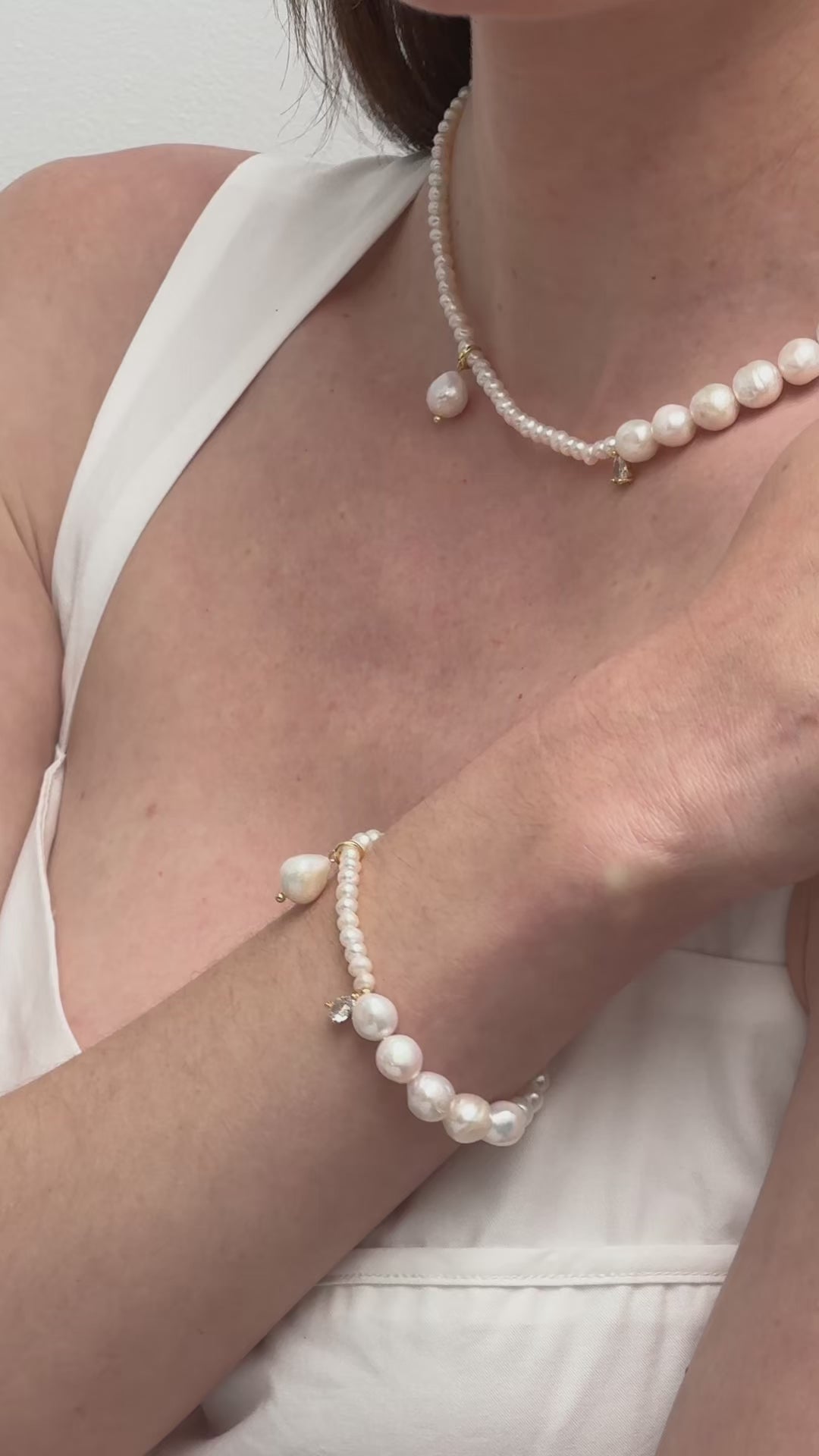 Freshwater Pearl Aurora Bracelet Two-thirds of the bracelet is composed of small pearls, transitioning into slightly larger irregular pearls, symbolizing the layers and rhythm of life and love.The pendant, featuring a slightly larger pearl and a tiny cubic zirconia, represents the heart of love gently embraced by light and blessings, casting a soft and romantic glow with every wear.