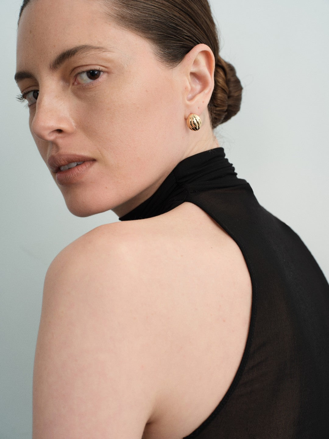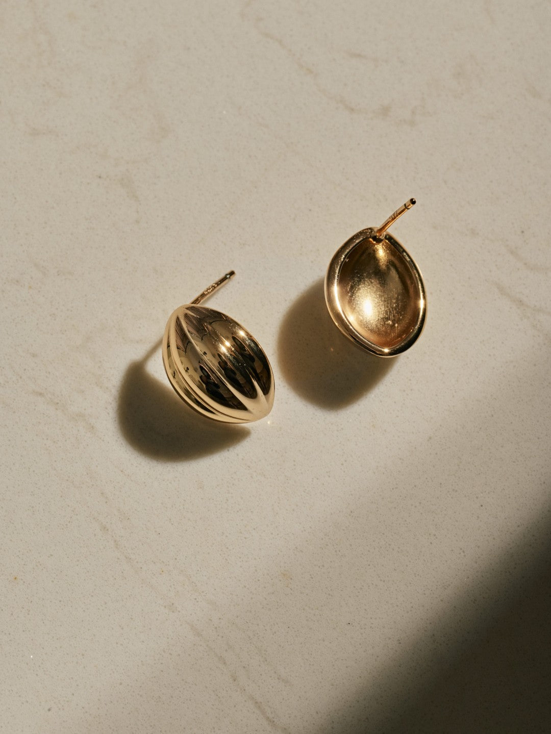 Shell Ellipse Vintage Gold Stud Earrings. Crafted from S925 silver with 18K gold plating, these stud earrings feature a hollow half-ellipse shell shape, offering a lightweight and comfortable wear. The vertical textures on the shell surface add depth and unique character. With a minimalist and modern design, they are subtly eye-catching, perfect for everyday wear or effortless styling with other jewelry pieces.