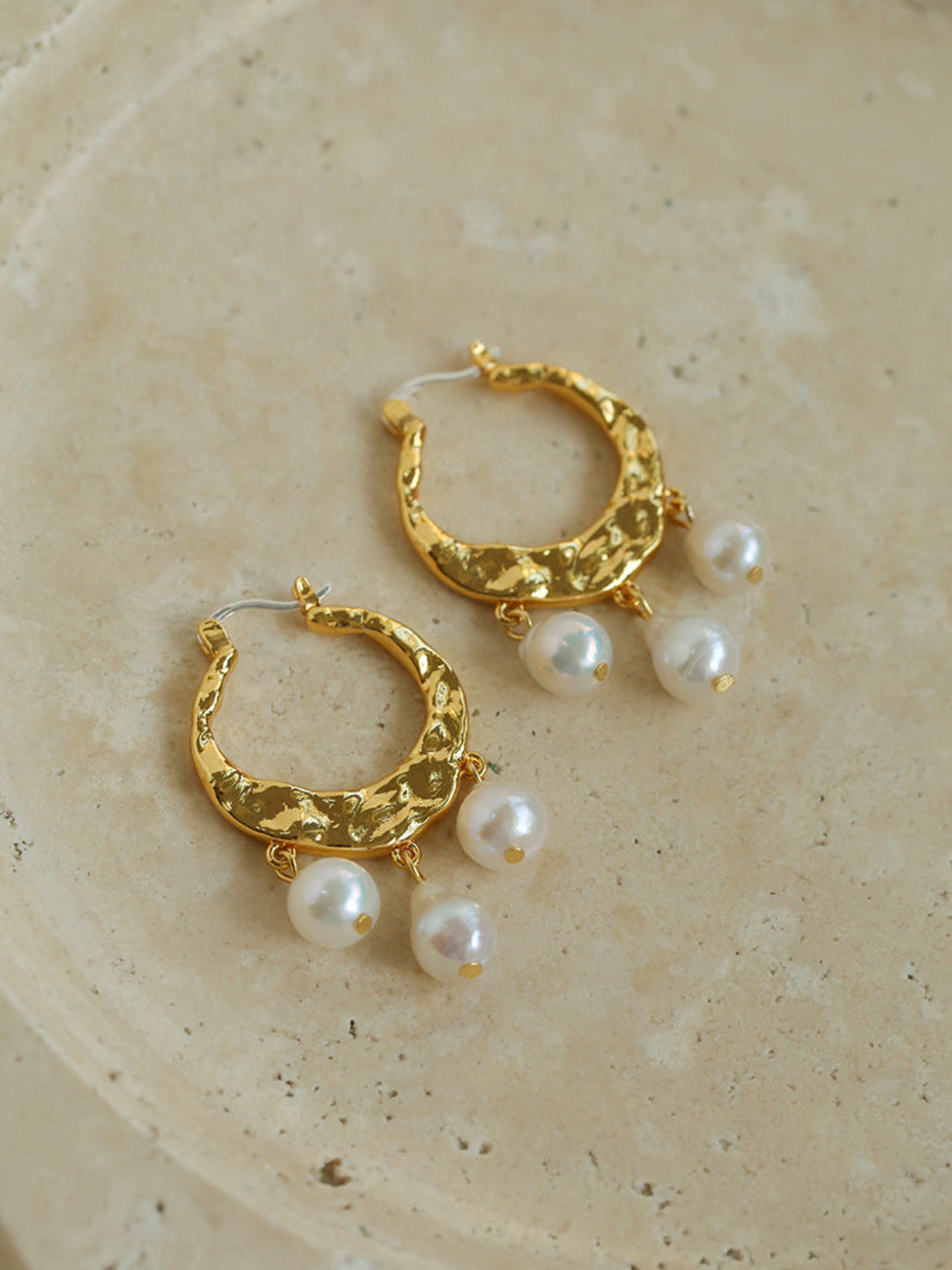 Introducing our Three Pearls Drop Hoop Earrings. These elegant earrings feature lustrous pearls gracefully suspended from sleek hoop designs, creating a chic and sophisticated look. Perfect for adding a touch of elegance to any outfit, they are ideal for both casual outings and special occasions. Shop now to enhance your accessory collection!