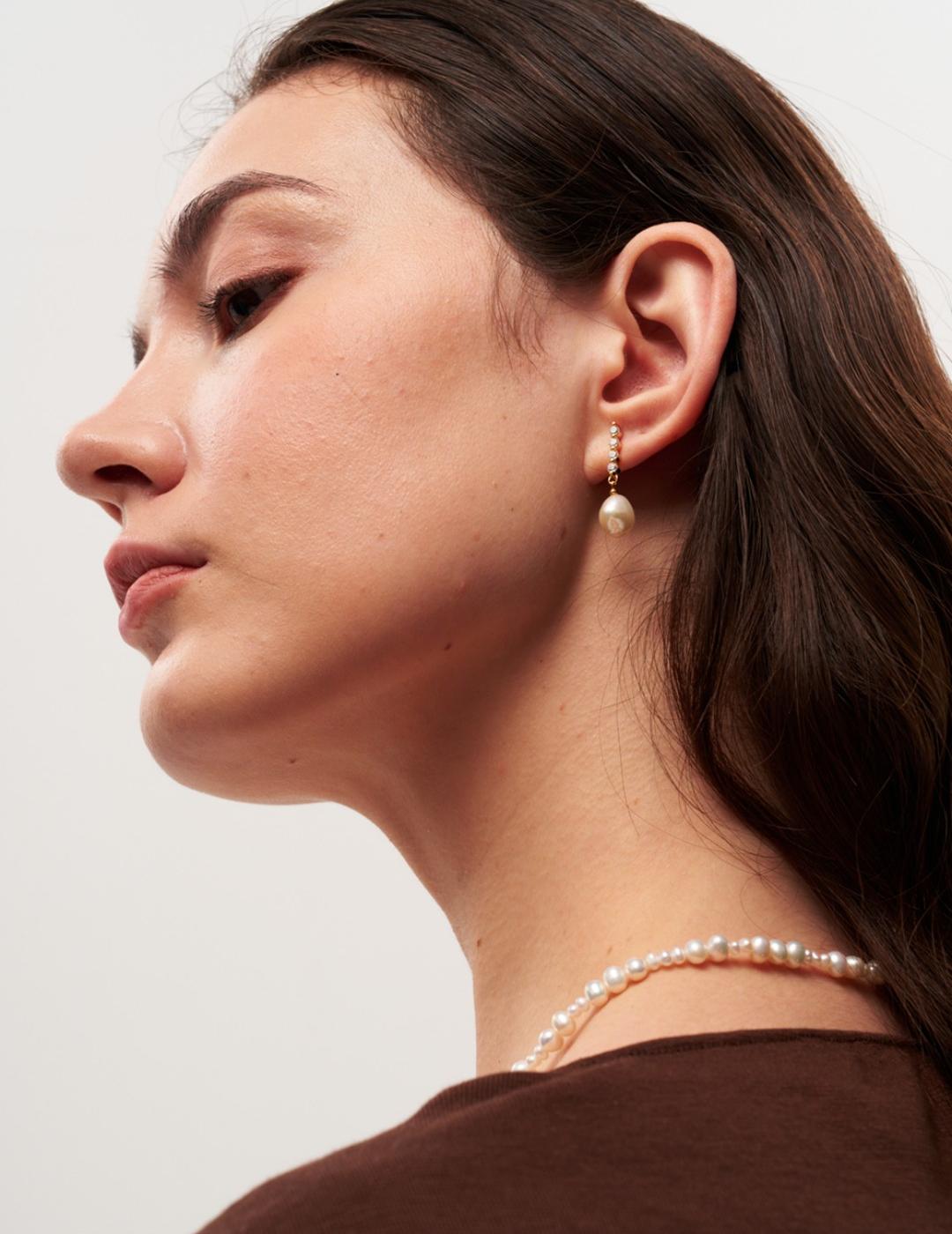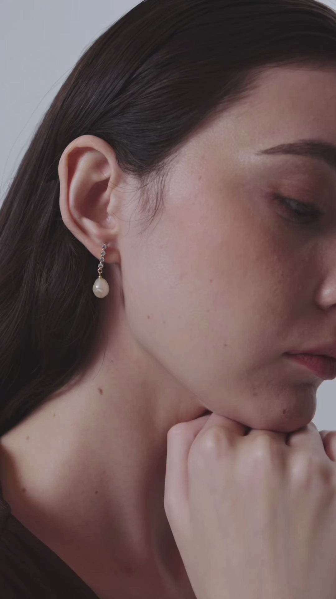The Vertical Zircon Freshwater Pearl Earrings are inspired by falling stars meeting quiet waves — a vertical line of shimmering zircons ending in a luminous freshwater pearl. Modern and graceful, they elongate the silhouette, adding effortless sophistication to both casual days and elegant nights. Timeless, versatile, and beautifully refined.