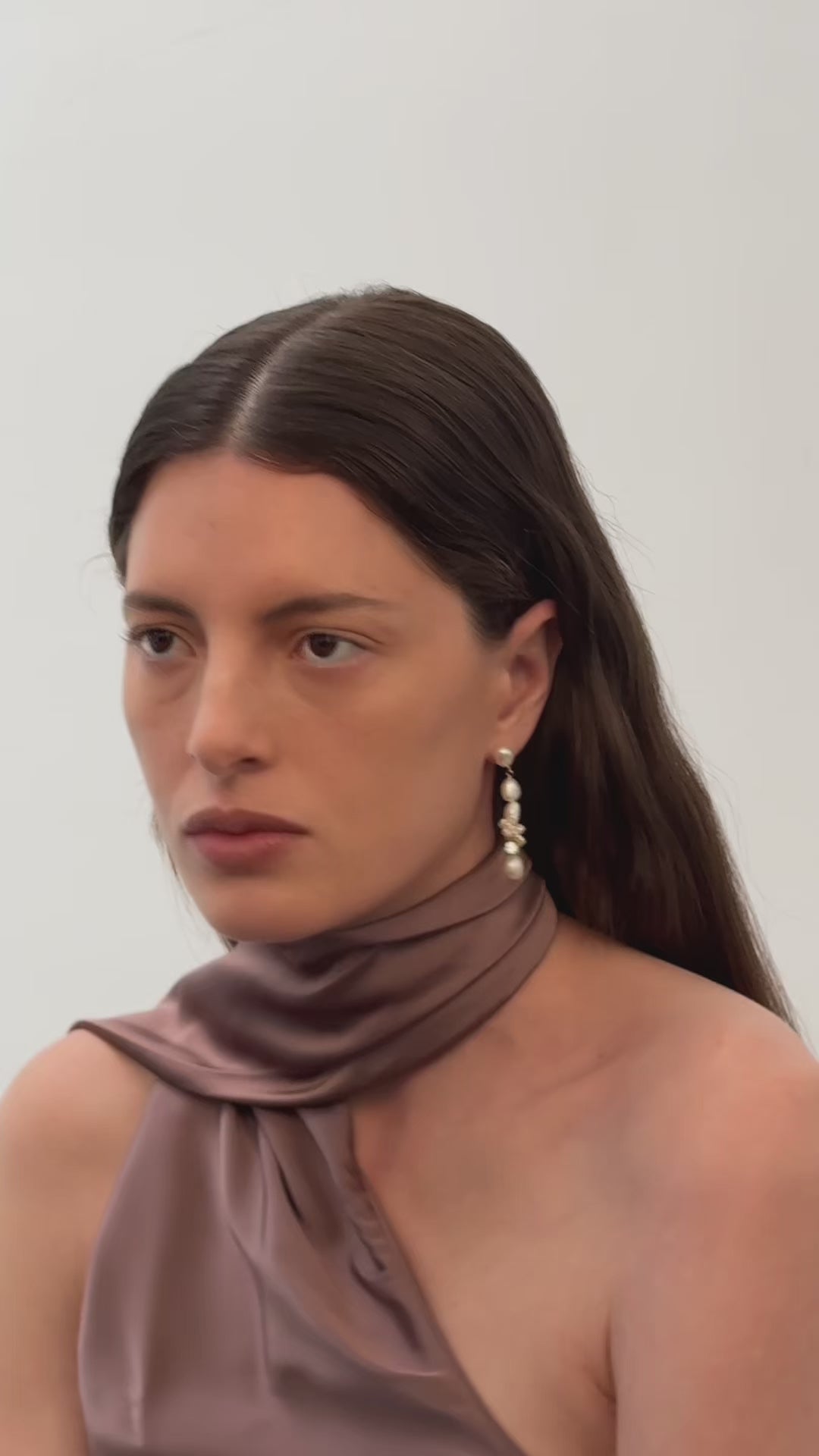The Capri Earrings feature six irregularly sized pearls linked together, naturally cascading along the earlobe to create a sense of fluid movement. Tiny pearls are delicately intertwined around the main pearls, like love and blessings gently embracing, filling every moment of wear with warmth and radiance. The overall design is elegant and dynamic, symbolizing the moments in life surrounded by love and tender care.