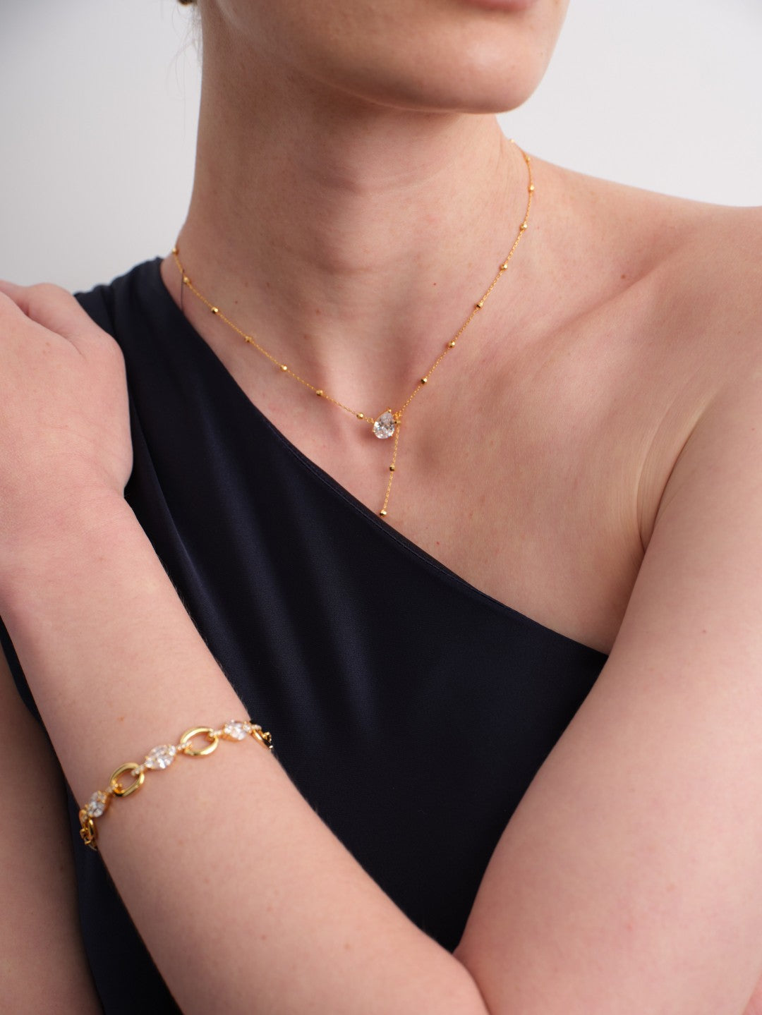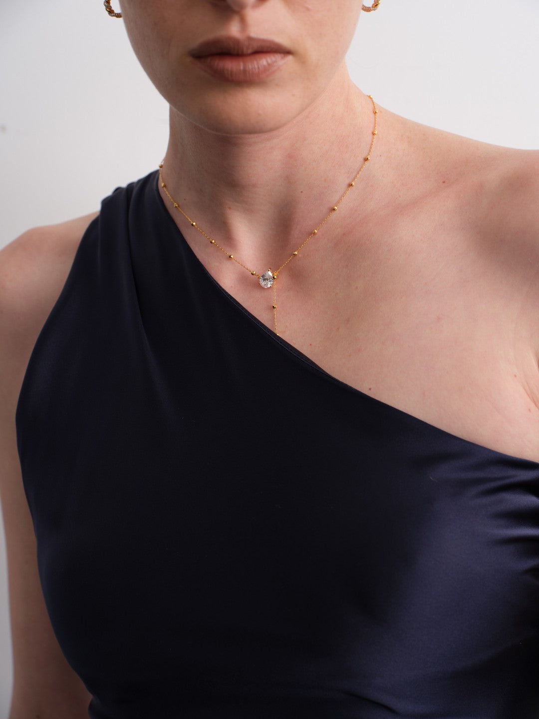 Rain Drop Lab-grown Diamond Gold Chain Necklace. Inspired by the moment just before a raindrop falls—clear, weightless, and quietly radiant.The golden chain drapes naturally along the neckline, creating a soft Y-shaped silhouette, while the teardrop high-carbon diamond at the end acts as a captured glimmer of light.It feels like wearing a single illuminated drop of morning rain on your collarbone—minimal, refined, and effortlessly captivating.