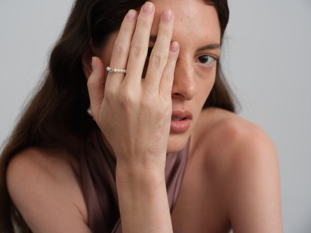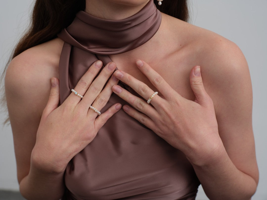 Amalfi Pearl Beaded Ring with Cubic zirconia is composed of irregularly shaped small pearls, symbolizing unique and authentic beauty. Cubic zirconia stones interspersed throughout sparkle in the light, like tiny blessings and radiant moments gently embracing your finger.The flexible design fits comfortably, representing the adaptability and embrace found in love and friendship.