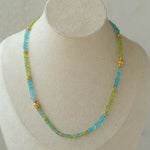 アースグリーンと穏やかなブルーが織りなすこのネックレスは、バランスと調和の感覚を醸し出し、エレガンスとパワーを求める方にぴったりです。単体でも重ねづけでも、その自然な美しさとエネルギーは、毎日の装いに欠かせないアイテムです。